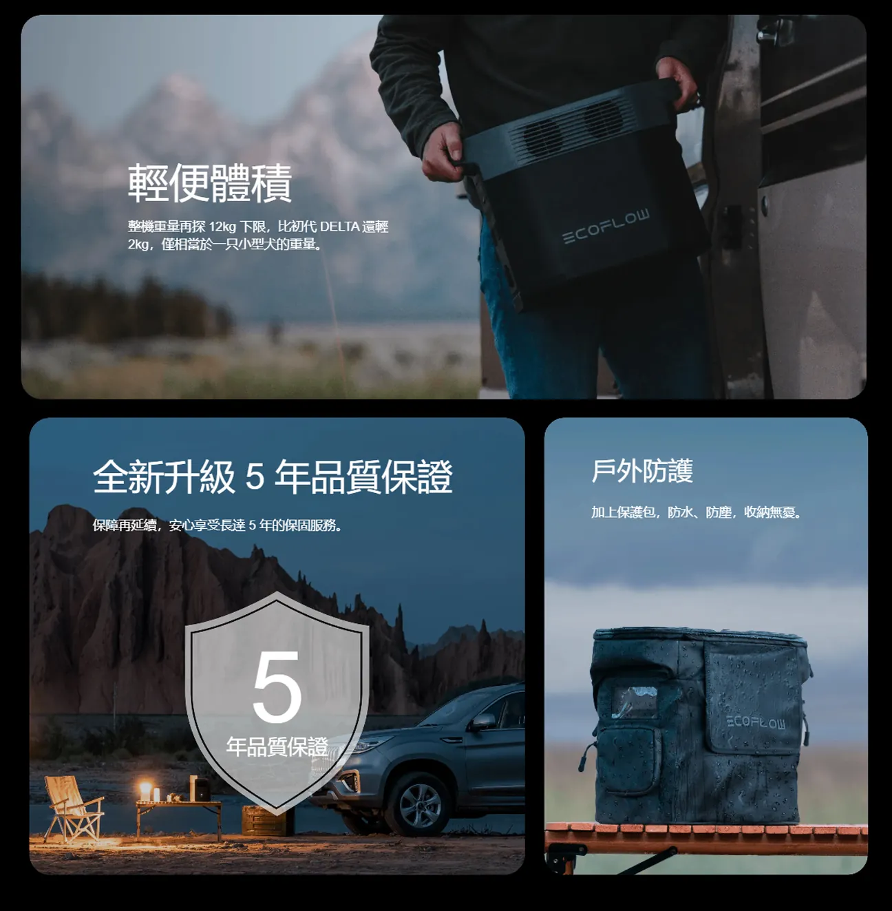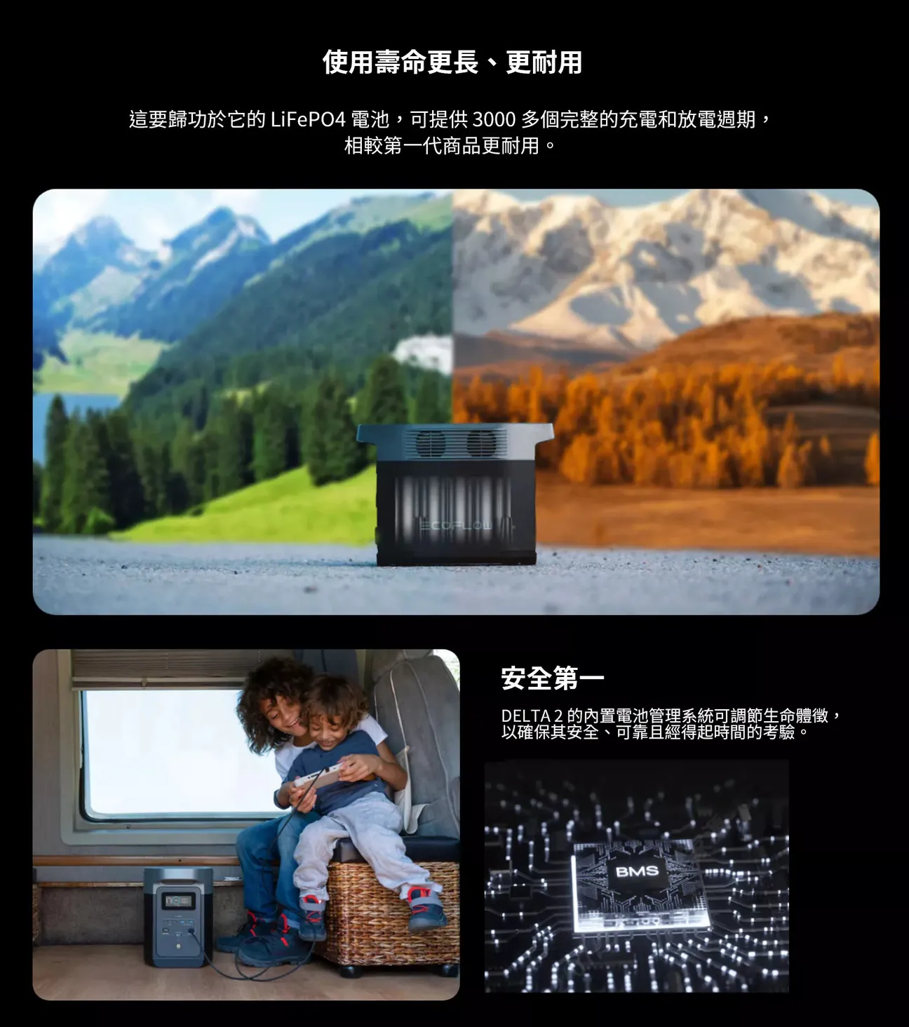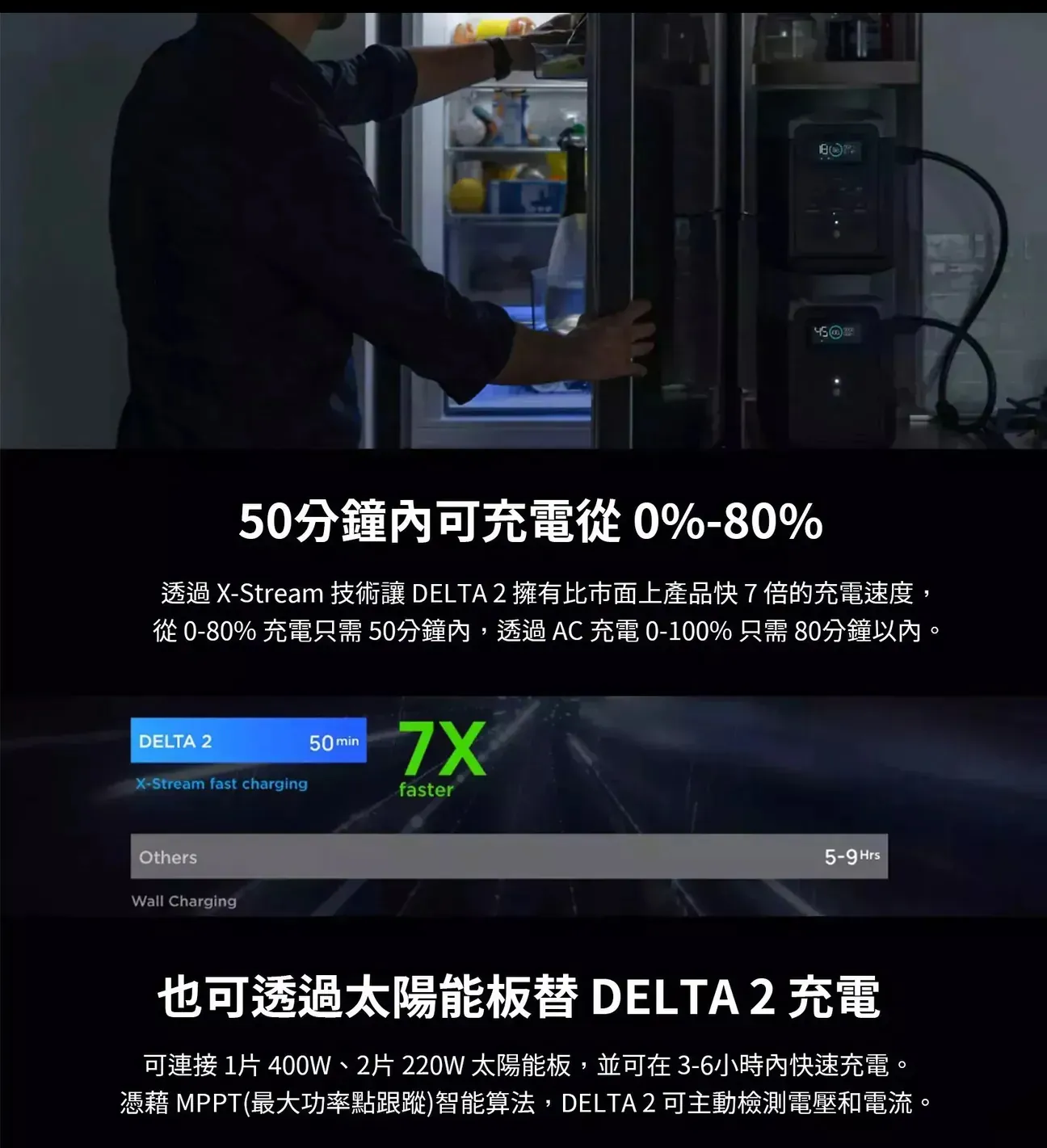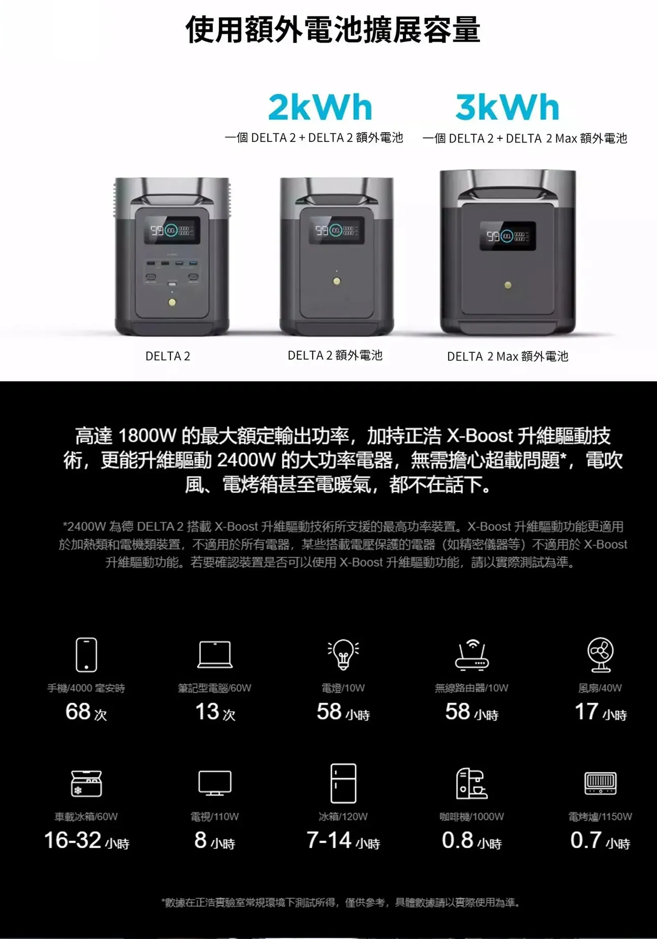• 電池容量1024Wh,搭配 DELTA 2 額外電池以達到 2048Wh