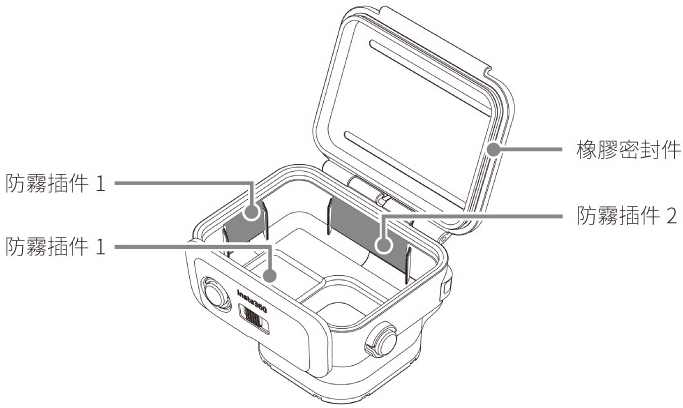 *如使用第三方防霧片,請確保防霧片1的尺寸在20 x 15 x 1.2 mm以內、防霧片2的尺寸在40 x 15 x 1.2 mm以內,如防霧片過大,可能會導致漏水並損壞相機。