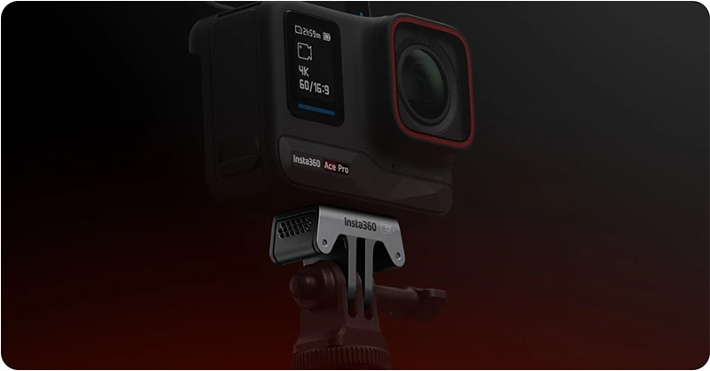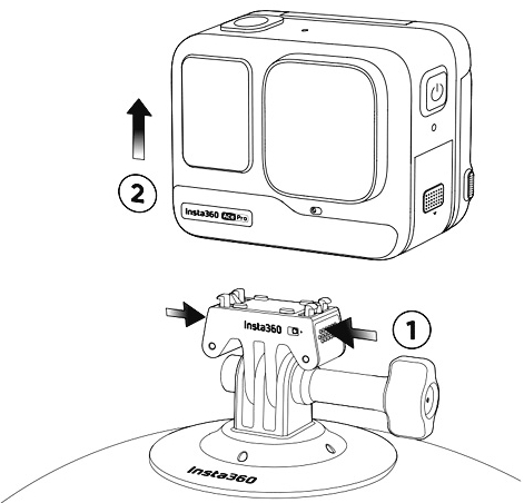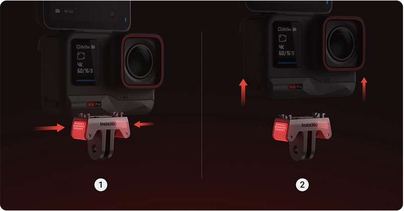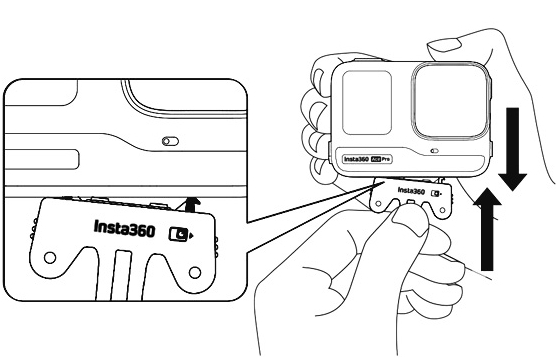 1.將相機鏡頭方向與標配支架上的圖標保持一致,將支架對準並吸附至相機底部的鎖扣凹槽,用力按壓至鎖扣發出喀嗒聲,然後可嘗試稍微拉動支架與相機,確保連接穩固。